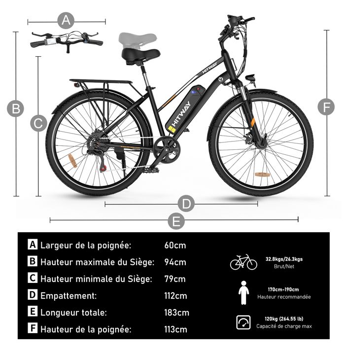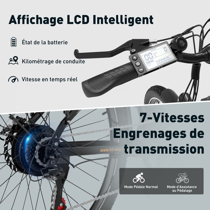 – Produktname: VAE Elektrofahrrad – HITWAY – Schwarz – 28 Zoll – herausnehmbarer Akku 250 W, 36 V, 13 Ah – Shimano 7 Gänge – elektrisches Mountainbike. Zielgruppe: Erwachsene